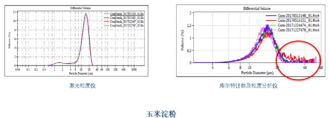 圖4:咖啡樣品,分布較寬,納米到1000+微米,2個(gè)批次僅在1000+微米處有一點(diǎn)變化導(dǎo)致平均粒徑變化18微米,高分辨技術(shù)仍然可以精準(zhǔn)地捕捉到,幫助QC很好實(shí)現(xiàn)質(zhì)控。