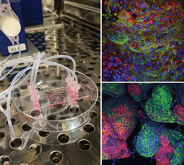 從左起:ibidi µ-Slide III 3D Perfusion用于hiPSC衍生的心臟微組織和腎臟類器官的共培養(yǎng)。在芯片上共培養(yǎng)72小時后保留的心臟和腎臟結(jié)構(gòu)(分別)的免疫熒光圖像。心臟肌節(jié)的標(biāo)記物:α-輔肌動蛋白-2(紅色)、肌鈣蛋白I(綠色)。腎臟腎單位結(jié)構(gòu)的標(biāo)記物:腎素(紅色)、lotus tetragonolobus lectin蓮藕凝集素(近端小管,綠色)。