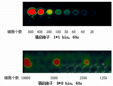 重組基因或融合蛋白的表達(dá)情況同樣直接影響熒光的強(qiáng)弱,這個(gè)過(guò)程主要是由啟動(dòng)子的強(qiáng)弱來(lái)控制的。如果實(shí)驗(yàn)中采用了弱啟動(dòng)子,那么在熒光檢測(cè)時(shí),很可能會(huì)導(dǎo)致熒光弱很多倍,這樣,即使有表達(dá)的部位,也可能因此而無(wú)法檢測(cè)到,北京博益?zhèn)I(yè)儀器有限公司的實(shí)驗(yàn)結(jié)果證明了這一點(diǎn)。以下圖為例,A圖采用了強(qiáng)啟動(dòng)子,在平板實(shí)驗(yàn)中,20個(gè)細(xì)胞就可以在1*1 bin,60秒被檢測(cè)到,而B圖中所采用的弱啟動(dòng)子,在8*8 bin,60秒時(shí)卻只能檢測(cè)到1250個(gè)細(xì)胞。