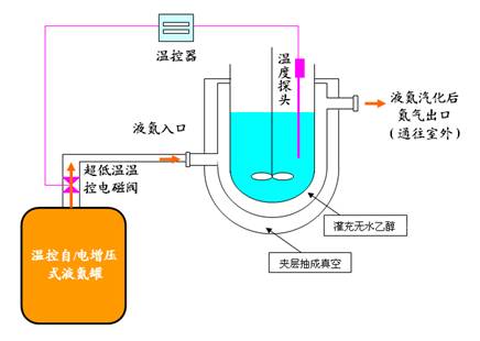 國內(nèi)超低溫反應(yīng)器的應(yīng)用目前主要用體現(xiàn)在合金(鈦合金、奧氏體不銹鋼等)反應(yīng)釜上,在玻璃反應(yīng)器方面,目前筆者所在公司已進(jìn)行了系統(tǒng)的探索并率先推出了產(chǎn)品。要經(jīng)濟(jì)的實現(xiàn)超低溫環(huán)境,肯定不應(yīng)該選擇兩級或三級以上的多級壓縮機(jī)制冷設(shè)備,鑒于液氮的使用成本不到2元/公斤,無論在實驗中還是在生產(chǎn)上,這種制冷方式得到大多數(shù)用戶的歡迎。但由于液氮沸點(diǎn)低(-195.8℃)、潛熱小、極易蒸發(fā)。要安全,經(jīng)濟(jì)地貯存、輸送和應(yīng)用液氮,必須要有絕熱性能良好的貯存和應(yīng)用設(shè)備。市場上液氮相關(guān)設(shè)備及管道配件大多采用英國人詹姆斯杜瓦發(fā)明的雙層壁真空容器結(jié)構(gòu)。而影響這種真空容器及配件性能的關(guān)鍵因素是夾層真空度。而且液氮的使用對反應(yīng)器控溫方式、保溫措施、材料性能、設(shè)備密封與壓力控制以及使用環(huán)境安全性措施等方面都提出了較高的要求。使用液氮制冷的玻璃反應(yīng)器仍然必須保留反應(yīng)過程透明可見的優(yōu)點(diǎn)。而且液氮具有健康危害性:皮膚接觸液氮可致凍傷。如在常壓下汽化產(chǎn)生的氮?dú)膺^量,可使空氣中氧分壓下降,引起缺氧窒息。我們開發(fā)出的超低溫控制設(shè)備可以分別用在單夾套與雙夾套的玻璃反應(yīng)器中,原理示意圖如下: