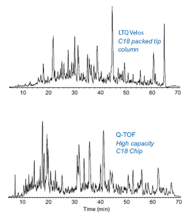 圖 2 : 1ug C.elegans 酶解樣品在 60 分鐘內(nèi)運(yùn)行色基峰色譜圖比較(上圖為 LTQ Velos 雙壓離子阱質(zhì)譜儀,下圖為四級(jí)桿飛行時(shí)間質(zhì)譜儀)