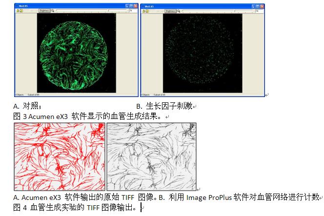Acumen eX3的大視野能力支持24或96多種規(guī)格的微孔板。在生長因子刺激后,細(xì)胞用calcein-AM 染色,通過Acumen eX3掃描后,血管生成的數(shù)量就可輕松確定8。軟件會(huì)得到總的血管面積;也可以將圖像輸出,由Image Pro Plus進(jìn)行血管長度以及分支數(shù)量的測定。