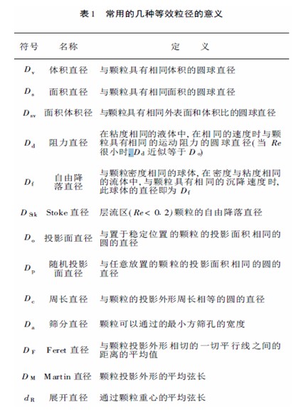 “等效”可以有很多方法:體積等效、橫截面積等效、沉降等效、光學(xué)等效等等,可以認(rèn)為有一種測量方法就有一種等效的意義。表1 給出了常用的幾種等效粒徑的定義[1]。