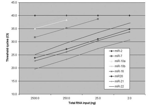 圖3。總RNA輸入的閾值循環(huán)(CT)值檢測(cè)8個(gè)miRNA的相關(guān)性。每RT反應(yīng)中,小鼠肺總RNA輸入范圍從0.025到250納克。將新桿狀線蟲的miRNA(MIR-2)列入作為陰性對(duì)照。