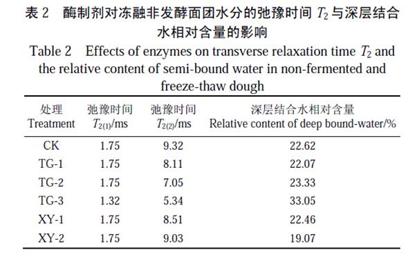 酶制劑對(duì)凍融非發(fā)酵面團(tuán)水分的弛豫時(shí)間T2 與深層結(jié)合水相對(duì)含量的影響
