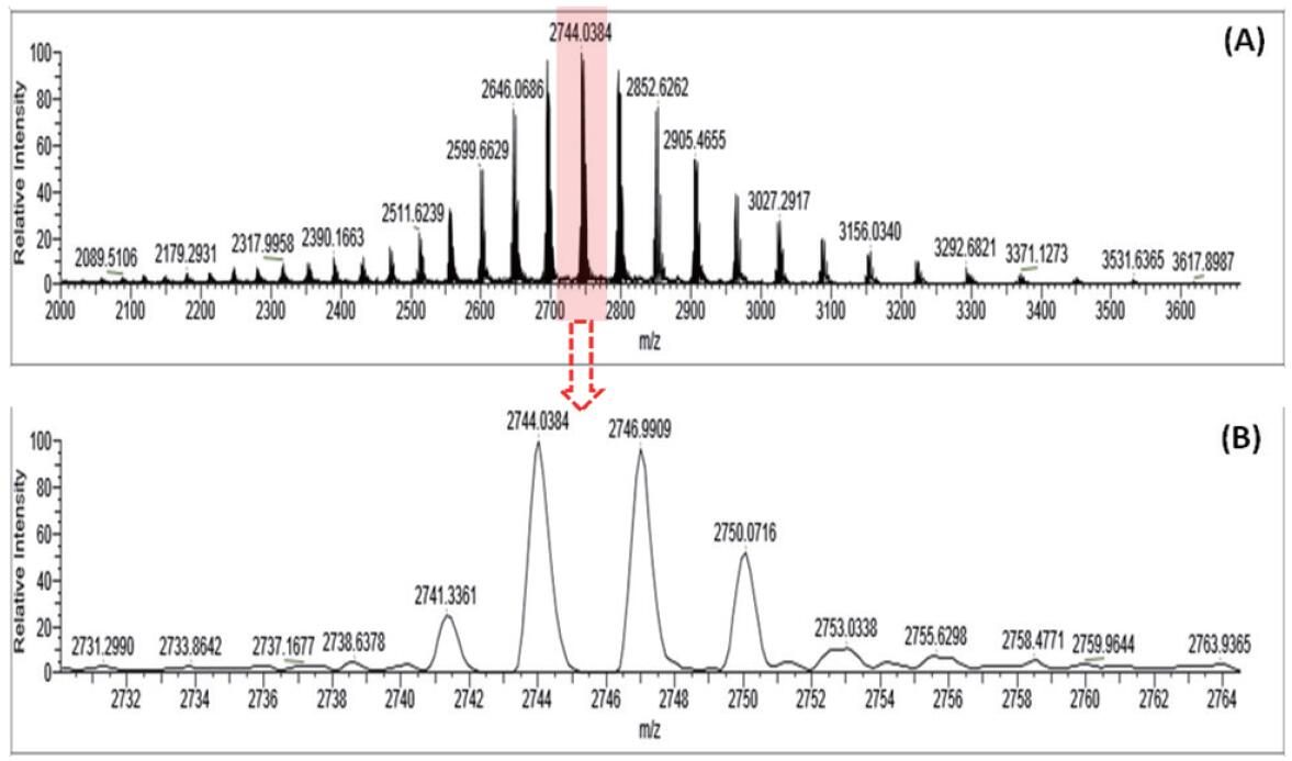 圖 2. LTQ-Orbitrap Elite 質(zhì)譜采集的單抗原始質(zhì)譜圖(A 為整體分布圖,B 為 m/z 為 2744.0384 的放大圖。)