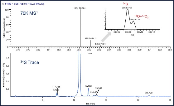 圖 4. 分辨率 70,000 FWHM 下泮托拉唑 34S 同位素峰分離和過(guò)濾結(jié)果