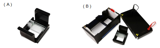 在后來(lái)的產(chǎn)品開(kāi)發(fā)中,Cleaver Scientific公司又進(jìn)一步改進(jìn)實(shí)驗(yàn)裝置,設(shè)計(jì)了懸浮的載玻架(Figure 3A),并在整套高通量彗星電泳實(shí)驗(yàn)裝置中配備了染色托盤,用來(lái)批量處理載玻片,同時(shí)還開(kāi)發(fā)了陶瓷冷卻底座(Figure 3B)和冷卻包,保證最佳的電泳緩沖液溫度,提高電泳效率。