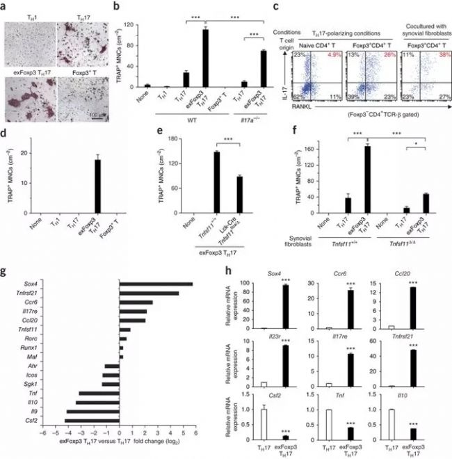 破骨細(xì)胞是造成關(guān)節(jié)炎骨破壞的重要因素。為了評(píng)估TH17細(xì)胞在關(guān)節(jié)炎中對(duì)骨破壞的影響程度,作者通過(guò)破骨細(xì)胞(TRAP染色的多核細(xì)胞,TRAP+MNs)計(jì)數(shù)和RANKL、細(xì)胞因子表達(dá),檢測(cè)其誘導(dǎo)破骨細(xì)胞生成的能力。將Foxp3hCD2小鼠與IL-17-GFP小鼠(該小鼠來(lái)源于百奧賽圖哦)交配,方便提取IL-17表達(dá)細(xì)胞。exFoxp3 TH17細(xì)胞、Foxp3+T細(xì)胞、IL17a-/-TH17細(xì)胞分別與滑膜成纖維細(xì)胞、骨髓源肥大和巨噬前體細(xì)胞(BMMs)共同培養(yǎng),結(jié)果顯示,exFoxp3 TH17細(xì)胞比TH17細(xì)胞(naïve CD4+T細(xì)胞來(lái)源的)具有更強(qiáng)的破骨細(xì)胞生成能力(圖4a,b)。 TH17細(xì)胞的誘導(dǎo)破骨細(xì)胞生成能力主要來(lái)自IL-17的表達(dá),IL-17可以刺激成纖維細(xì)胞上RANKL表達(dá), TH17細(xì)胞雖然本身也產(chǎn)生RANKL,但細(xì)胞自身單獨(dú)沒(méi)有辦法誘導(dǎo)破骨細(xì)胞生成。而IL17a-/- exFoxp3 TH17細(xì)胞缺失IL-17A表達(dá)仍可以誘導(dǎo)破骨細(xì)胞生成,說(shuō)明是T細(xì)胞來(lái)源的RANKL或細(xì)胞因子而不是IL-17A對(duì)破骨細(xì)胞生成有潛在影響(圖4b)。作者發(fā)現(xiàn)exFoxp3 TH17細(xì)胞比naïve CD4+T細(xì)胞來(lái)源的TH17細(xì)胞 表達(dá)了更高水平的RANKL,經(jīng)過(guò)滑膜成纖維細(xì)胞共同培養(yǎng),RANKL表達(dá)進(jìn)一步增強(qiáng)。(圖4c)