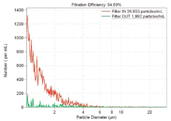 通過對(duì)比過濾前后的測(cè)試結(jié)果可以評(píng)估過濾效率,過濾掉的粒子數(shù)目占過濾前粒子數(shù)目的百分比即代表了過濾的效率。