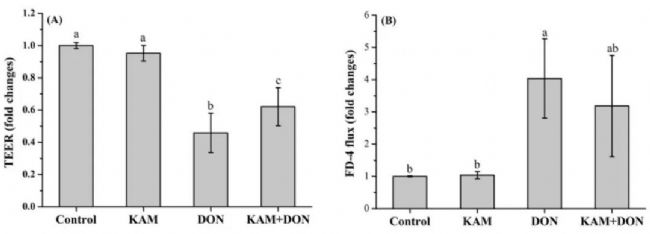 圖1 KAM和DON對Caco-2細胞模型的影響(A) TEER和(B) FD-4通量