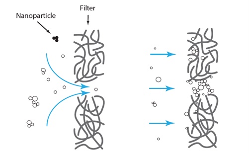事實上,納米級的顆粒如果更換分散介質(zhì)在氣相環(huán)境中,也可以形成一種穩(wěn)定的分散系:氣溶膠。而將氣溶膠技術與過濾技術結合,便可以輕松實現(xiàn)纖維表面的負載沉積。這一方法借鑒了“口罩”過濾的方式,納米級氣溶膠會在氣流的帶動下,從過濾介質(zhì)的孔隙中穿過,顆粒則會在這一過程中均勻的分散在基底表面與內(nèi)層。