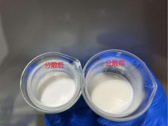 2號(hào)樣品分散前顆粒感明顯,表面漂浮大量顆粒,分散后樣品顏色變淺,表面未見(jiàn)顆粒。