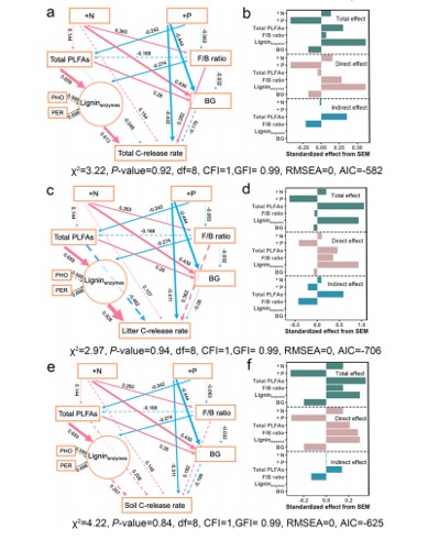 結(jié)構(gòu)方程模型(SEM)表明12個(gè)月田間分解試驗(yàn)?zāi)?020年12月),土壤和微生物性質(zhì)如何影響總(a)、凋落物(c)和土壤(e)C釋放。在(b)、(d)和(f)中,總效應(yīng)是直接和間接效應(yīng)的總和。