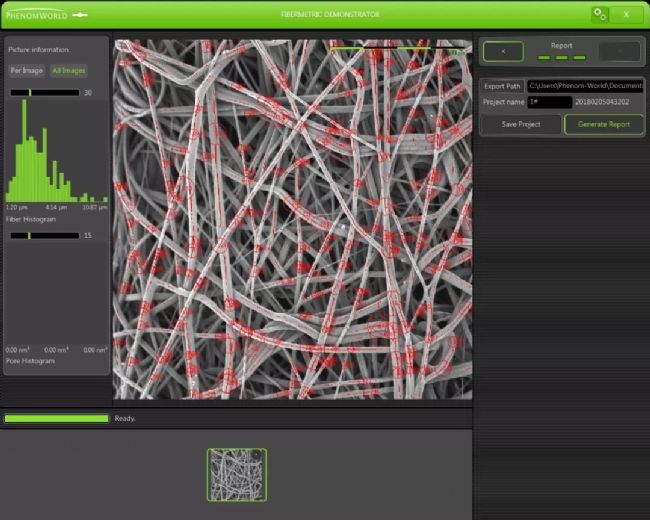靜電紡絲工藝對(duì)紡絲纖維的直徑影響較大,而紡絲纖維直徑又與性能息息相關(guān)。為了對(duì)靜電紡絲工藝進(jìn)行評(píng)價(jià),需要統(tǒng)計(jì)大量的紡絲纖維直徑,而傳統(tǒng)的人工統(tǒng)計(jì)費(fèi)時(shí)費(fèi)力,還可能存在人為統(tǒng)計(jì)誤差。Phenom 飛納臺(tái)式掃描電鏡搭載的 FiberMetric 軟件結(jié)合了 AI 算法,可以全自動(dòng)地進(jìn)行紡絲纖維的識(shí)別和纖維直徑的測(cè)量。