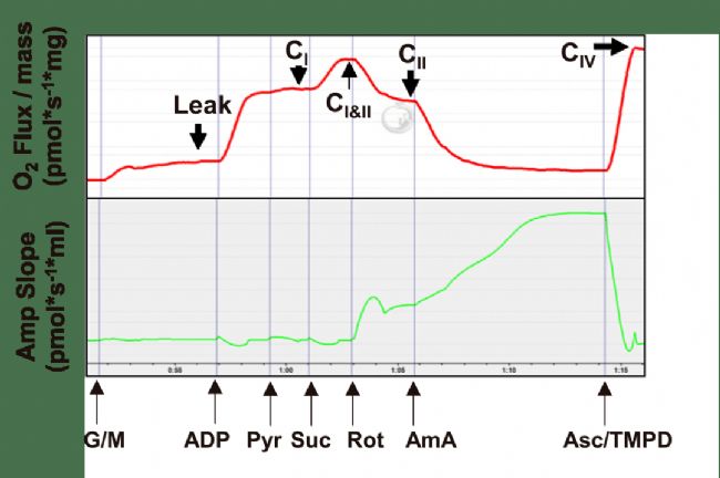 隨著不同試劑的加入,針對骨骼肌內(nèi)線粒體的各個復(fù)合物進行了耗氧率觀察,并同時檢測伴隨而來的活性氧的產(chǎn)出情況。