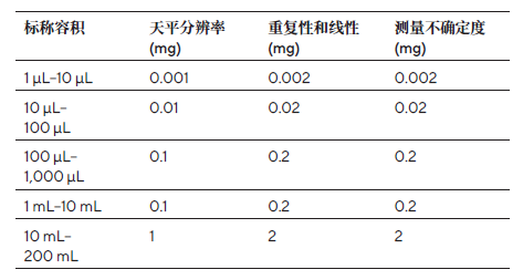 表1. 根據(jù)移液器的標(biāo)稱體積確定的天平最小分辨率要求。如果天平的標(biāo)準(zhǔn)測(cè)量不確定度是已知的,則應(yīng)使用該值,而不使用重復(fù)性值和線性值(ISO8655-6:2002,第2頁)。