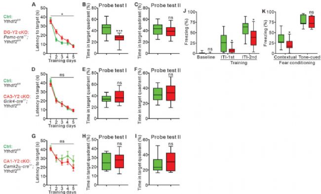 圖3.特異性敲除齒狀回(而非其它亞區(qū))的YTHDF2會損害動物的學(xué)習(xí)和記憶功能