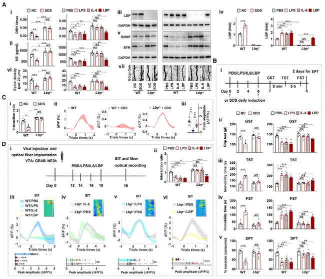 圖5:壓力應(yīng)激和炎癥通過上調(diào)LBP誘導(dǎo)小鼠的抑郁樣病理特征