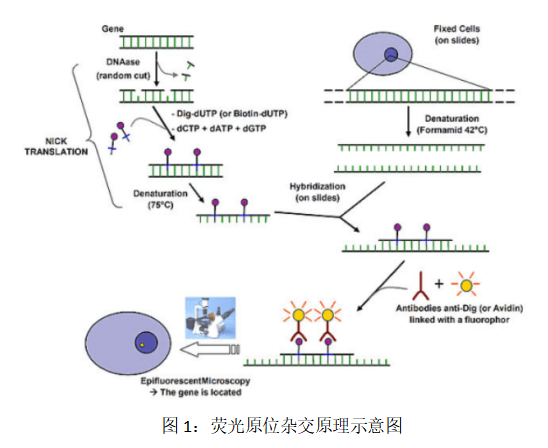 熒光原位雜交(Fluorescence in situ hybridization FISH)是一種非放射性原位雜交技術(shù),同時也是一種新型的分子生物學(xué)與細(xì)胞遺傳學(xué)相結(jié)合的技術(shù)。熒光原位雜交技術(shù)是利用熒光檢測系統(tǒng)對DNA進(jìn)行定性、定量或相對定位分析的技術(shù),其基本原理是根據(jù)DNA序列的互補(bǔ)性,用已知的熒光素、生物素標(biāo)記的核酸探針與待檢測樣本的DNA進(jìn)行雜交,形成可檢測的雙鏈核酸雜交。