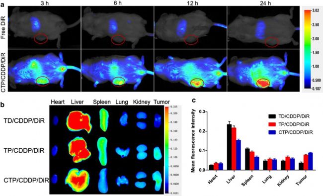 采用薄膜分散法制備殼寡糖(COS)包被、唾液酸(SA)受體靶向的順鉑(CDDP)和一氧化氮(NO)共載體納米膠束(CTP/CDDP),并用DiR標(biāo)記膠束,然后利用體內(nèi)成像系統(tǒng)評(píng)價(jià)CTP/CDDP/DiR的腫瘤靶向性。如圖2a所示,游離DiR在注射后經(jīng)歷了快速的藥物代謝和血液循環(huán)清除,在腫瘤內(nèi)幾乎檢測(cè)不到其熒光信號(hào)。DiR標(biāo)記的CTP/CDDP膠束給藥后3h,腫瘤組織內(nèi)可見(jiàn)明顯的熒光,且熒光強(qiáng)度隨時(shí)間延長(zhǎng)而增強(qiáng)。