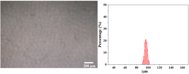 微滴交聯(lián)固化分散于PBS中的海藻酸鈉微球平均粒徑為96.08 μm,具有極高的單分散性(變異系數(shù):CV=2.52%)。其顯微鏡圖和粒徑分布如下圖所示: