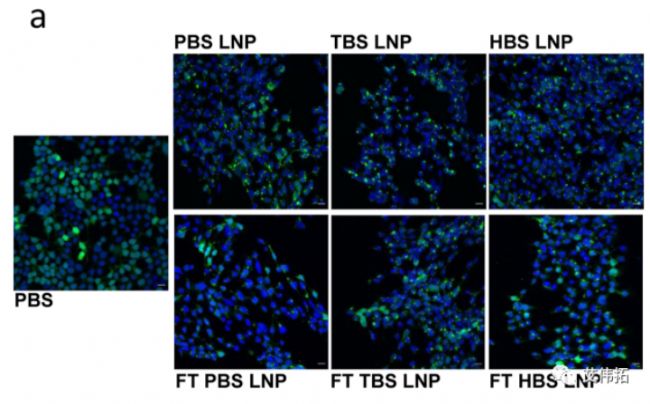 結(jié)果表明,通過體外和體內(nèi)轉(zhuǎn)染衡量,在HEPES和Tris體系中的LNPs總體上優(yōu)于PBS。與PBS相比,HEPES和Tris作為冷凍保護劑,可以在更大程度上保存LNPs的結(jié)構(gòu)和mRNA的遞送效率。