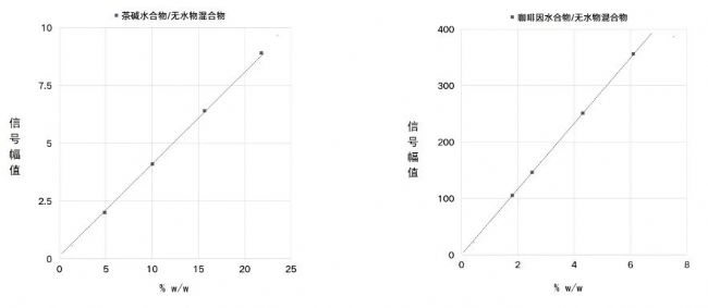 分別把茶堿、咖啡因的水合物和無水物按照重量比例0/100、25/75、50/50、75/25和100/0(%w/w)進行混合,然后選擇對應(yīng)序列進行測試,得到信號強度和時間,將不同混合度的結(jié)果進行線性擬合,顯示了非常好的線性度(茶堿R2=0.998,咖啡因R2=1)。[4]