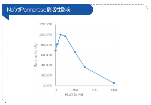 不同鈉離子濃度下酶活力檢測圖Pannarase在中等Na“濃度條件下活性較高,300mM時仍有36.2%的活性,但濃度超過600mM時酶活性基本完全喪失