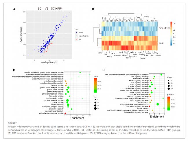為了進(jìn)一步研究PLD在SCI中的作用,研究人員使用細(xì)胞因子芯片對(duì)假手術(shù)組、脊髓損傷組和脊髓損傷7天并給與PLD抑制劑FIPI組進(jìn)行分析,首先提取脊髓組織蛋白,并滴加到細(xì)胞因子微陣列芯片上,4℃ 孵育過夜,然后對(duì)載玻片進(jìn)行清洗,隨后加入一抗室溫孵育2小時(shí),再進(jìn)行清洗,并加入Cy3 標(biāo)記的鏈霉親和素在室溫下避光孵育1小時(shí),清洗后使用法國(guó)Innopsys的InnoScan 300(新型號(hào)InnoScan 710)熒光掃描儀進(jìn)行熒光信號(hào)分析,其中共檢測(cè)了200種不同的細(xì)胞因子表達(dá)水平。結(jié)果:SCI和SCI+FIPI組中有71種細(xì)胞因子表達(dá)存在差異,炎癥相關(guān)因子在SCI+FIPI組表達(dá)顯著下調(diào),包括腫瘤壞死因子以及炎癥相關(guān)信號(hào)通路(TNF信號(hào)通路和NF-κB信號(hào)通路)。這表明FIPI在蛋白水平上對(duì)脊髓損傷具有一定的抗炎作用。