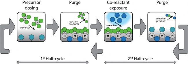 圖 1.由兩個(gè)半周期組成的典型 ALD 循環(huán)示意圖。連續(xù)的前驅(qū)體和共反應(yīng)劑劑量通過氣體吹掃或泵(抽真空)操作步驟分隔,導(dǎo)致自限性薄膜生長(zhǎng)。“M”表示金屬原子,例如可以與氧原子或氮原子(藍(lán)色)結(jié)合,分別形成金屬氧化物或金屬氮化物。前驅(qū)體配體呈綠色,通過與共反應(yīng)物反應(yīng)而消除,最后被清除。