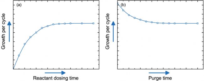 圖 3.每個(gè)循環(huán)的理想生長(zhǎng) (GPC) 作為 (a) 反應(yīng)物(前驅(qū)體或共反應(yīng)物)加料時(shí)間和 (b) 吹掃時(shí)間的函數(shù),說明了自限性 ALD 行為。達(dá)到飽和后,添加額外的前驅(qū)體或延長(zhǎng)吹掃時(shí)間不會(huì)導(dǎo)致 GPC 發(fā)生變化。請(qǐng)注意,必須測(cè)量前驅(qū)體(或共反應(yīng)物)投料時(shí)間為 0 秒時(shí)的數(shù)據(jù)點(diǎn)。當(dāng)吹掃時(shí)間太短時(shí),可能會(huì)發(fā)生寄生 CVD,從而導(dǎo)致 GPC 升高。