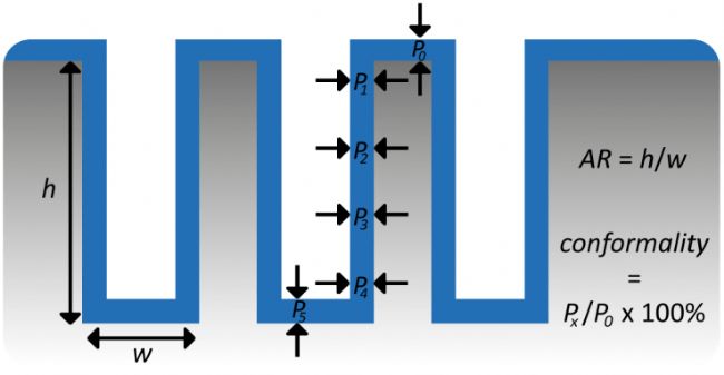 圖 5.保形性解釋示意圖,保形性可以定義為溝槽中不同位置處的薄膜厚度相對(duì)于溝槽頂部厚度的比率。溝槽具有縱橫比(AR),其定義為溝槽的高度除以寬度。