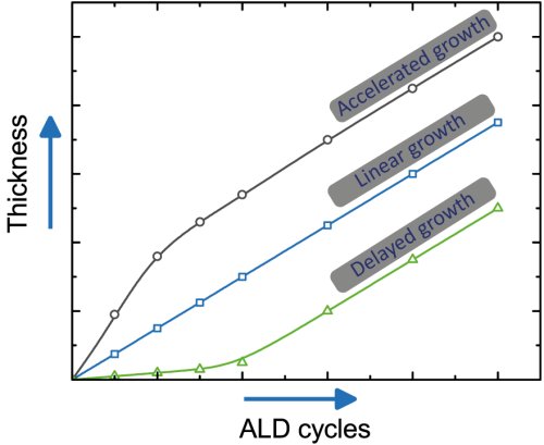 圖 6.厚度與 ALD 循環(huán)次數(shù)的關(guān)系示例,說明了初始 ALD 循環(huán)期間加速、線性和延遲生長(zhǎng)之間的差異。