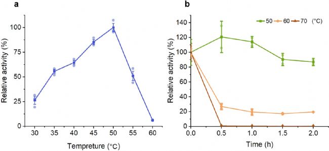 經(jīng)測(cè)定,部分脫糖的IsPETase-Pp的最適溫度為50℃(Fig.1a),高于先前的文獻(xiàn)報(bào)道[4]。此外,與之前的報(bào)道相比,部分脫糖IsPETase-Pp的熱穩(wěn)定性更高,在50℃下孵育2小時(shí)后,其活性仍保持在90%左右。在60°C和70°C時(shí),活性急劇下降,在2小時(shí)后活性不到20% (Fig.1b)。