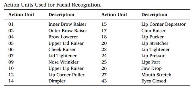 使用FaceReader分析面部表情,可以獲得六種基本情緒:快樂、悲傷、生氣、驚訝、害怕和厭惡,以及中性情緒。平均準確率為99%。此外,F(xiàn)aceReader可以測量20個最常見的面部動作單位(Action Unit, AU),以0 ~ 1的取值表示其強度,以此獲得實時效價和喚醒度數(shù)據(jù)。效價的計算為快樂情緒強度減去強度最高的負面情緒強度,喚醒度的計算基于表1所示的20個動作單元的激活值。