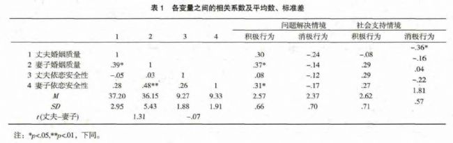進(jìn)行相關(guān)分析,結(jié)果如表1所示,妻子的婚姻質(zhì)量只與夫妻問題解決互動(dòng)中的積極行為相關(guān),妻子的依戀安全性與其婚姻質(zhì)量、夫妻問題解決積極行為均存在顯著正相關(guān)。丈夫婚姻質(zhì)量只與夫妻社會(huì)支持互動(dòng)中的消極行為相關(guān);丈夫依戀安全性與其婚姻質(zhì)量及夫妻溝通行為相關(guān)都不顯著。