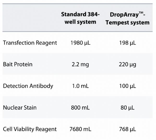 表 1. DropArray™/Tempest 系統(tǒng)減少了試劑的使用量。將DropArray™ 板與 Tempest 液體分配器結(jié)合使用,可將所需的轉(zhuǎn)染試劑減少 90%。