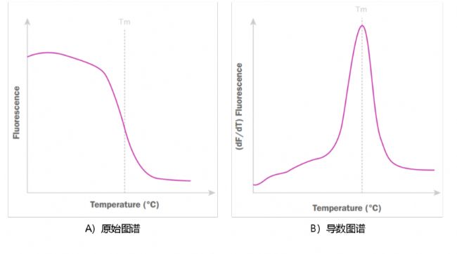 典型的熔解曲線步驟,通常從60℃增加到95℃使反應(yīng)樣品緩慢變性,同時每0.1-0.5℃逐步收集熒光。隨著溫度的逐漸升高,雙鏈DNA會逐漸解鏈成單鏈,嵌入到雙鏈DNA小溝上的熒光染料分子也會逐漸脫落下來,熒光強(qiáng)度隨之逐漸下降。熒光強(qiáng)度的累積數(shù)據(jù)點(diǎn)與溫度的關(guān)系曲線就是熔解曲線的原始圖譜。在到達(dá)某個溫度時,DNA雙鏈解開一半,且熒光強(qiáng)度驟然下降,該溫度即稱為熔解溫度(Tm)。當(dāng)擴(kuò)增子達(dá)到Tm時,熒光強(qiáng)度會突然下降,這與擴(kuò)增子長度和GC含量有關(guān)。