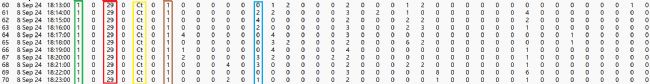 紅色框代表monitor的編號,黃色框是數(shù)據(jù)類型(Ct, count,計(jì)數(shù),果蠅阻斷紅外光束),褐色代表有光照(1代表白天,0代表黑夜),藍(lán)色代表阻斷紅外線的次數(shù)。