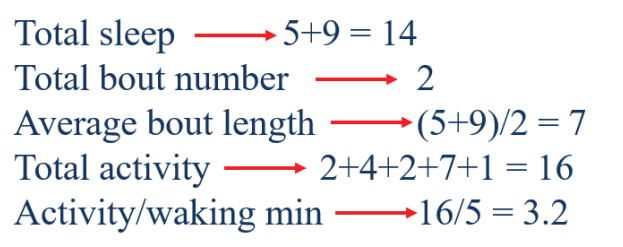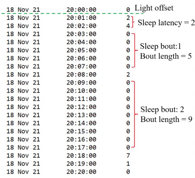 果蠅的睡眠定義為持續(xù) 5 分鐘或更長時(shí)間的不間斷行為不活躍(活動計(jì)數(shù)為 0)。因此,任何大于或等于五個(gè)連續(xù)零的時(shí)段(bin的長度1min)都被視為睡眠事件(sleep bout)。