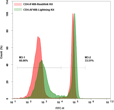 采用ReadiLink™ Rapid iFluor488抗體標(biāo)記試劑盒(貨號1255)和Lightning-Link® Rapid Alexa Fluor®488兩種標(biāo)記系統(tǒng)分別制備熒光標(biāo)記的抗人CD4抗體,通過ACEA NovoCyte流式細(xì)胞儀的FITC通道(激發(fā)/發(fā)射波長:488/530 nm)對人外周血單個(gè)核細(xì)胞(PBMC)進(jìn)行流式檢測分析。