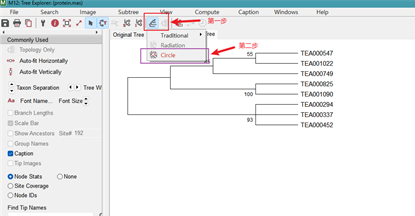 (4)通過菜單欄和左側(cè)的工具欄,可對生成的系統(tǒng)發(fā)育樹進(jìn)行美化,這里選擇把系統(tǒng)發(fā)育樹從長條狀變成圓形,同時也可以編輯分支的粗細(xì)和字體等。