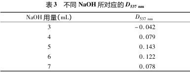 (4)NaOH用量的選擇。在5支已標(biāo)號(hào)的潔凈比色管中,各加入20mL1μg/mL鎘標(biāo)準(zhǔn)溶液,分別加入3、4、5、6、7mL1mol/LNaOH溶液,再分別加入15mL0.002%雙硫腙、1mL20%鹽酸羥胺、1mL50%酒石酸鉀鈉、1mL20%OP乳化劑,用蒸餾水稀釋至刻度線,搖勻,靜置20min;在紫外-可見分光光度計(jì)上用1cm的比色管測(cè)定吸光度,采用空白試劑作為參比。