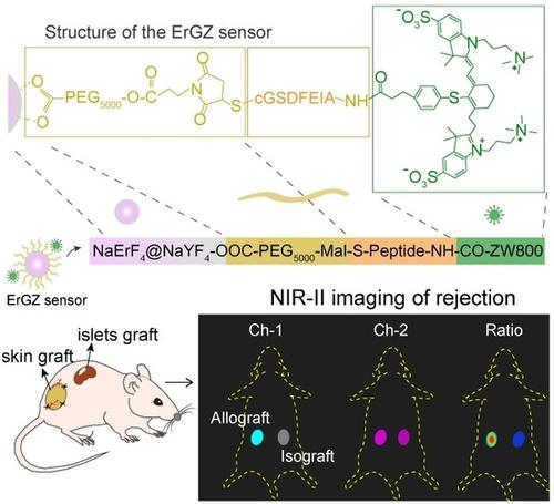 早期診斷異體移植排斥反應(yīng)有助于改善移植受體的免疫相關(guān)管理。目前,臨床使用的芯針活檢方法是有創(chuàng)的,且容易產(chǎn)生采樣誤差。通過在體熒光成像監(jiān)測(cè)免疫相關(guān)過程具有無(wú)創(chuàng)、反饋快和靈敏度高等優(yōu)點(diǎn)。鑒于此,研究團(tuán)隊(duì)開發(fā)了一種靈敏的近紅外二區(qū)(NIR-II)熒光納米傳感器(ErGZ)來(lái)實(shí)現(xiàn)對(duì)異體移植排斥反應(yīng)的無(wú)創(chuàng)早期檢測(cè)。