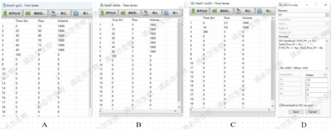 本次共設(shè)計三種補(bǔ)料策略(圖3、圖4),分別是時間序列(圖3 BC)、關(guān)聯(lián)DO PV值(圖3 D)和通過用戶自定義功能(UDF,User-Defined Functions)(圖4)對補(bǔ)料速度進(jìn)行調(diào)控。