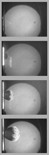 因此,能夠以5.2km/s的時速記錄鋁球形物體撞擊薄鋁屏障的沖擊閃光和碎片云的形成和擴散,每幅照片的成像序列為5us,曝光時間為20ns。(見圖三)一種具有連續(xù)閃光時間的氙氣閃光燈光源在背光模式下使用80us。相比之下菲格的閃光X光照片。2,可見沖擊閃光的形成和擴散以及碎片云前部由于沖擊波加熱而產生的高溫氧化。將傳統(tǒng)系統(tǒng)與超高速數碼相機相結合,提供了成幀率高達5億幀/秒的數字高速多幀放射攝影系統(tǒng)的可能性。