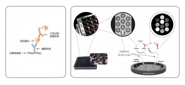 MSD技術(shù)則融合電化學(xué)與化學(xué)發(fā)光優(yōu)勢,以石墨電極微孔板為載體,將捕獲抗體固定于電極表面,通過“捕獲抗體-目標(biāo)分子-SULFO-TAG™標(biāo)記檢測抗體”的夾心反應(yīng)形成復(fù)合物。施加電壓后,SULFO-TAG™標(biāo)記物在電極表面發(fā)生循環(huán)氧化還原反應(yīng)釋放光子,信號強(qiáng)度與目標(biāo)濃度呈正相關(guān),憑借電化學(xué)信號的可控性,顯著降低背景干擾,靈敏度可達(dá)fg級別,且支持每孔10-100種指標(biāo)的定制化檢測。