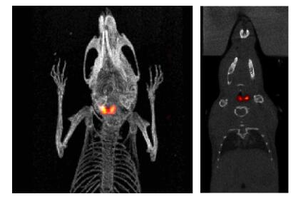 圖 8. 來(lái)自肺腫瘤模型研究的小鼠的 PET(左)和 PET/CT( 右) 圖像, 6.47MBq( 175μ Ci)