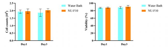 1、分別使用水浴鍋與NU-F10細胞復(fù)蘇儀對凍存的細胞進行復(fù)蘇至解凍完全,水浴鍋歷時150s,NU-F10歷時130s。